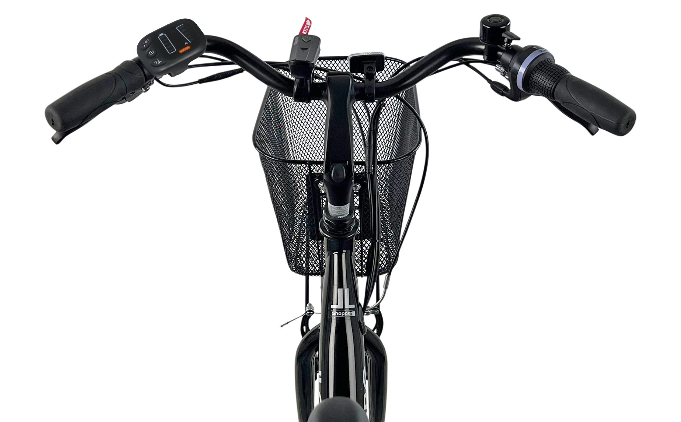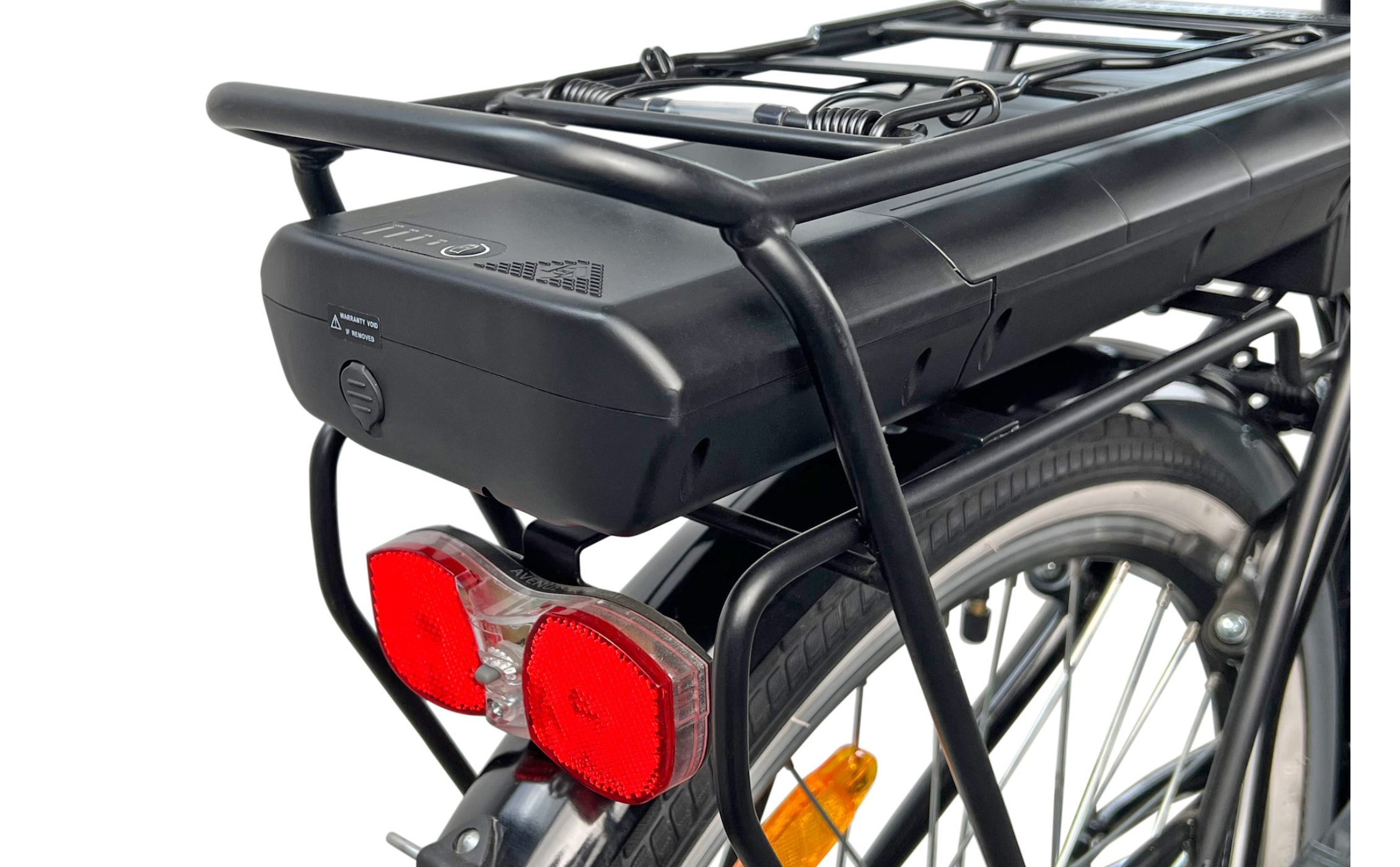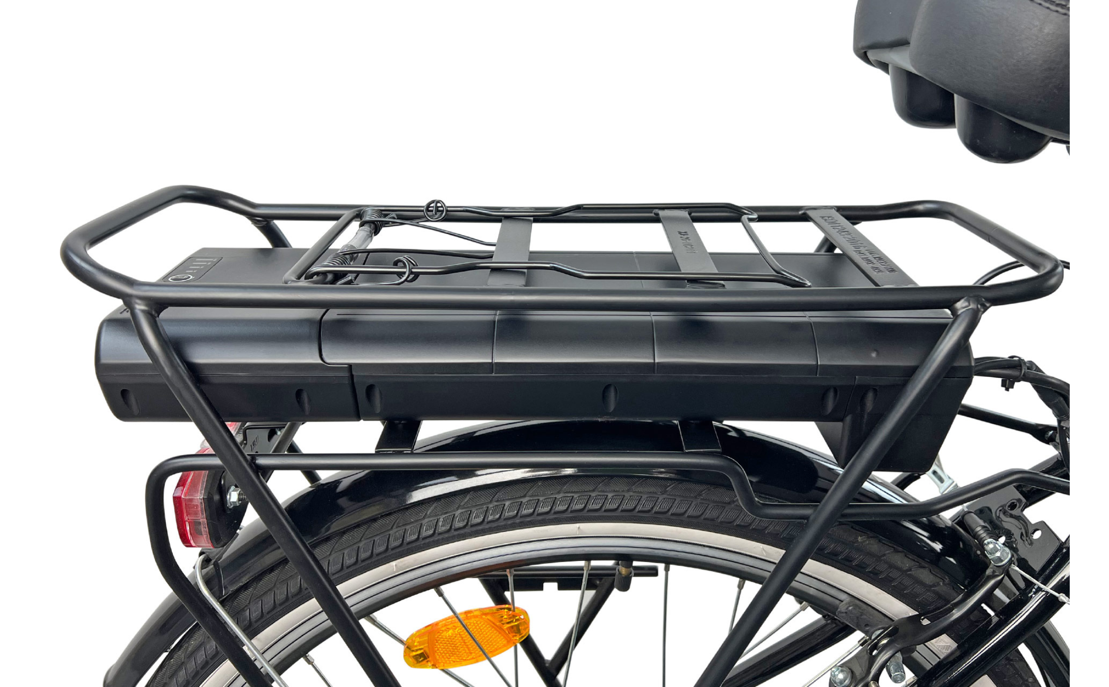 Das Shopper verfügt über einen Gepäckträger- Akku mit einer Reichweite von bis zu 60 km. Der leicht zugängliche Ladeport ermöglicht bequemes Aufladen, ohne die Batterie zu entnehmen. Die innovative Technologie sorgt für maximale Effizienz und Komfort – einfach anschließen und laden, während die Batterie sicher im Gerät bleibt.