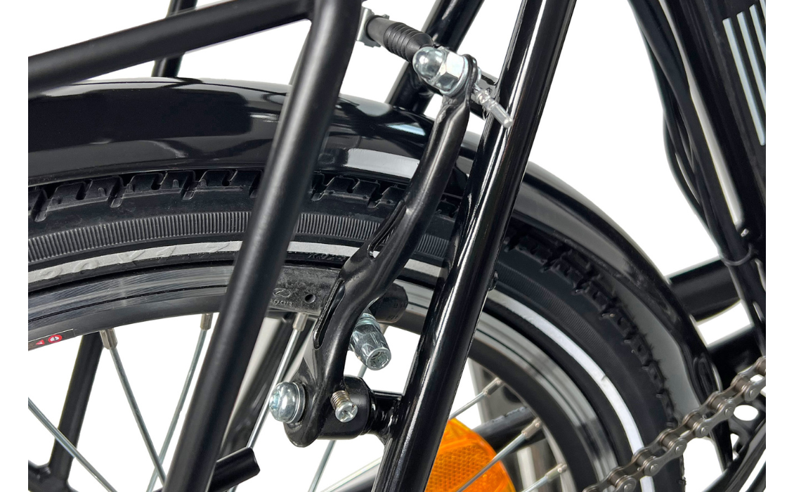 Die Felgenbremsen vorne und hinten sind leicht justierbar und ermöglichen eine sichere Bremsung des Bikes