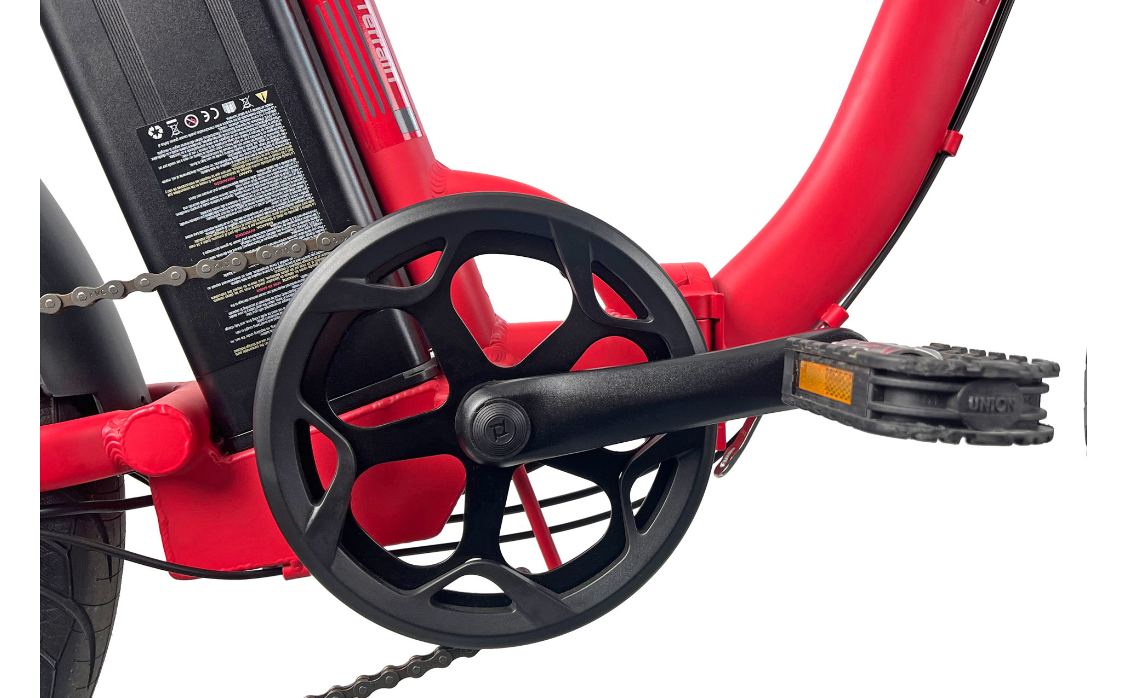 Der leistungsstarke 36 V Hinterradmotor sorgt für eine optimale Kraftübertragung und ein müheloses Fahrgefühl. Die 7-Gang-Kettenschaltung hinten ermöglicht geschmeidiges Schalten, effizientes Treten, optimale Kraftübertragung, einfache Handhabung und Anpassung an Steigungen sowie flachem Gelände.
